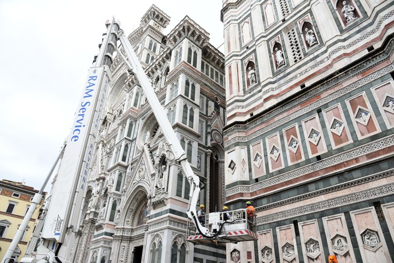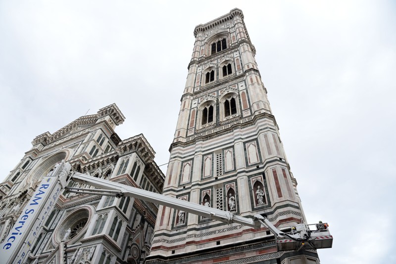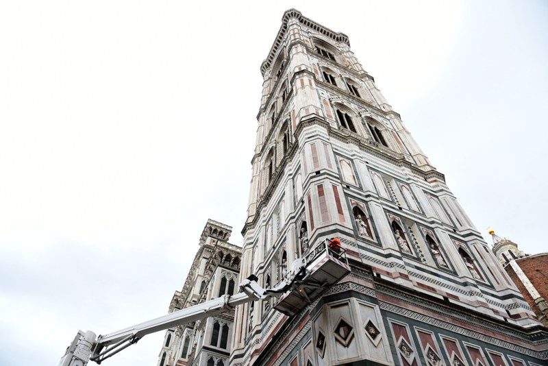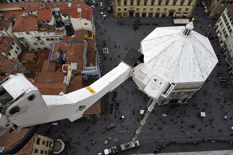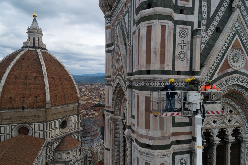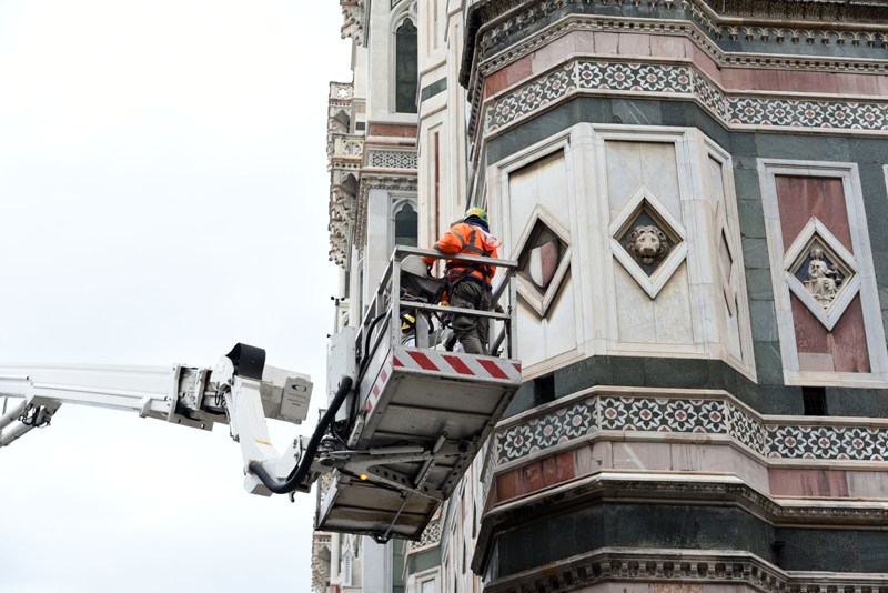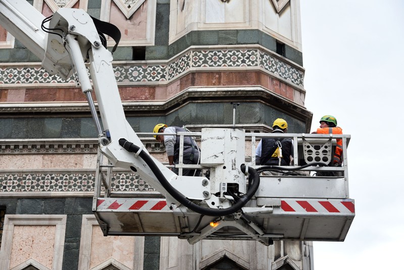 Stamani sono iniziati i lavori di monitoraggio delle superfici marmoree del complesso monumentale del Duomo di Firenze che andranno avanti tre settimane. I monitoraggi sono iniziati dal Campanile di Giotto e proseguiranno sulle superfici esterne del Duomo, della Cupola del Brunelleschi e del Battistero. I lavori sono eseguiti dal personale dell’Opera di Santa Maria del Fiore con l’ausilio di un’autogrù con un braccio di 103 metri che permette di raggiungere anche le zone più alte del Campanile di Giotto e della Cupola del Brunelleschi.