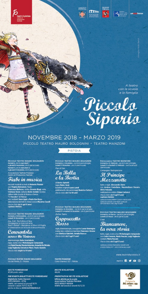 Torna l'atteso appuntamento con "Piccolo Sipario", la rassegna di teatro per le scuole e il pubblico delle famiglie, promossa dall'Associazione Teatrale Pistoiese, al Piccolo Teatro Mauro Bolognini e al Teatro Manzoni, con Comune di Pistoia, Fondazione Cassa di Risparmio di Pistoia e Pescia, Regione Toscana, MiBACT ed il sostegno importante di Unicoop Firenze. Sei appuntamenti (per un totale di 19 recite, di cui 13 per le scuole e 6, alla domenica pomeriggio, per le famiglie) in programma da novembre a marzo, con la presenza di compagnie qualificate sul fronte del teatro per l’infanzia (Pupi di Stac, Zaches Teatro, Teatropersona, Crest, Tra il dire e il fare/La luna nel letto) a cui si aggiunge la partecipazione della Scuola di Musica "Mabellini" di Pistoia. Altissima, anche quest'anno, l'adesione dei vari istituti, con quasi tutte le recite della mattina già esaurite, per una programmazione che può diventare l'occasione per un’idea-regalo natalizia da condividere in famiglia, mettendo “Il Teatro sotto l’albero”. La rassegna è realizzata con il contributo della Gelateria Monterosa, partner anche della stagione di prosa del Teatro Manzoni.