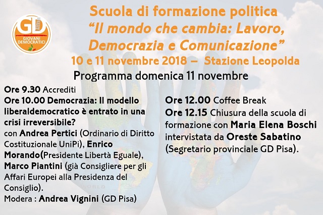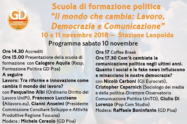 Come Giovani Democratici abbiamo pensato e ideato una scuola di formazione politica provinciale rivolta principalmente ai giovani iscritti e simpatizzanti del Partito Democratico. L'evento avrà inizio alle ore 15:00 di sabato 10 novembre presso i locali della Stazione Leopolda di Pisa e proseguirà anche la mattina di domenica 11.
