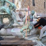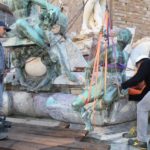 Nove statue bronzee che stanno alla base della fontana del Nettuno di piazza Signoria sono state rimosse per essere portate in un laboratorio di restauro. L’operazione, con tanto di imbracatura e gru di 30 metri, ha consentito di far letteralmente ‘volare’ i bronzi, dal peso di alcune tonnellate, fino alla completa rimozione e trasporto in un laboratorio di restauro alla periferia di Firenze.