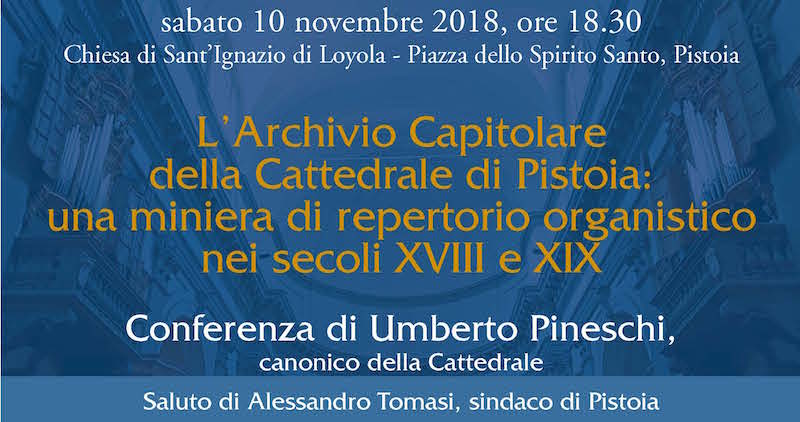 Sabato 10 novembre presso la Chiesa di S. Ignazio di Loyola a Pistoia Umberto Pineschi, canonico della Cattedrale, terrà una conferenza dal titolo “L’Archivio Capitolare della Cattedrale di Pistoia: una miniera di repertorio organistico nei secoli XVIII e XIX”, durante la quale saranno eseguiti anche brani esemplificativi tratti dalle opere per organo di Giuseppe e Luigi Gherardeschi.