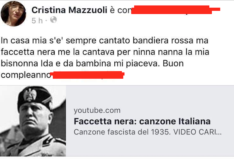 È polemica a Carmignano per un post su Facebook da parte della consigliera comunale del M5S Cristina Mazzuoli. A puntare il dito contro di lei è l'Anpi Prato, in particolare la presidentessa provinciale Angela Riviello. Mazzuoli ha augurato il buon compleanno a un amico postando il video di Faccetta Nera, con tanto di anteprima di foto di Benito Mussolini. La pubblicazione ha scatenato la risposta dell'Anpi.