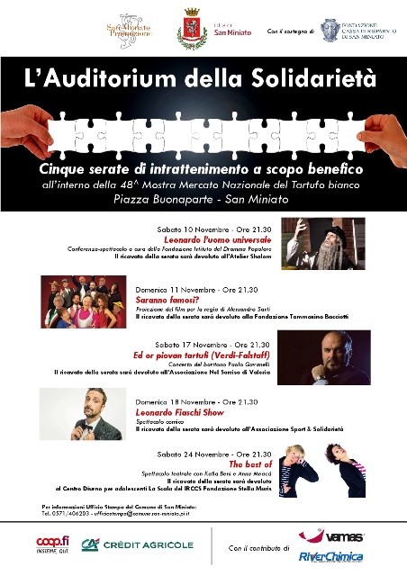 Un'altra importante iniziativa è quella dell'Auditorium della Solidarietà, cinque serate di intrattenimento a scopo benefico all'Auditorium di Piazza Buonaparte (con ingresso ad offerta). Si comincia sabato 10 novembre, alle 21.30, con Leonardo l'uomo universale, una conferenza-spettacolo a cura della Fondazione Istituto del Dramma Popolare. Il ricavato sarà devoluto all'Atelier Shalom. Domenica 11 novembre, alle 21.30, proiezione del film per la regia di Alessandro Sarti, “Saranno famosi?”. Il ricavato della serata sarà devoluto alla Fondazione Tommasino Bacciotti Onlus.