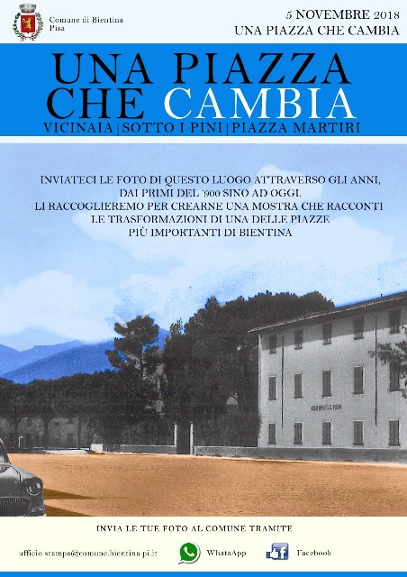Nella storia del paese di Bientina Piazza Martiri della Libertà è cambiata più volte: dalla "Vicinaia", a "sotto i pini", alla odierna Piazza Martiri. Da lunedì 5 novembre la piazza sta per cambiare ancora, prima con il taglio degli storici pini e poi con la piantumazione dei nuovi alberi che avverrà nei mesi successivi. L’amministrazione comunale, però, desidera che la memoria di questo luogo (e delle sue trasformazioni) sia sempre presente. Per questo ha deciso di raccogliere le immagini che la immortalano nel corso del tempo (da quelle più antiche a quelle più recenti). Le immagini raccolte verranno custodite con lo scopo di farne una mostra, sia fisica che virtuale, per ricordare a cittadini di Bientina e non di come è stata e di come si è trasfor-mata la piazza durante i decenni: il suo aspetto, i suoi frequentatori, le sue storie.