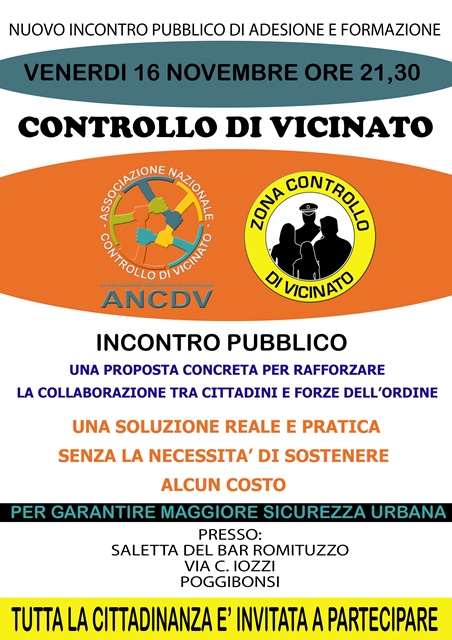 Si terrà venerdì 16 Novembre alle 21:30 presso la saletta del Bar Romituzzo di Poggibonsi, un nuovo incontro da parte dell'Associazione Nazionale Controllo di Vicinato.