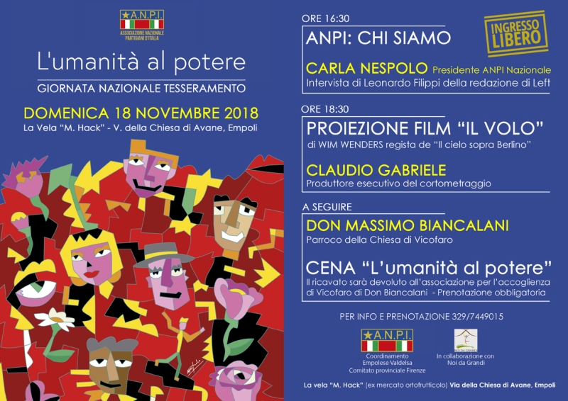 L’Umanità al potere, questo il titolo dell’evento realizzato dal Comitato Anpi Empolese Valdelsa il 18 novembre, in una delle giornate nazionali del tesseramento 2019. L’evento che si terrà a La Vela M.Hack, in via della Chiesa a Avane a Empoli (zona ex mercato ortofrutticolo), sarà aperto dalla presidente nazionale Anpi, Carla Nespolo.