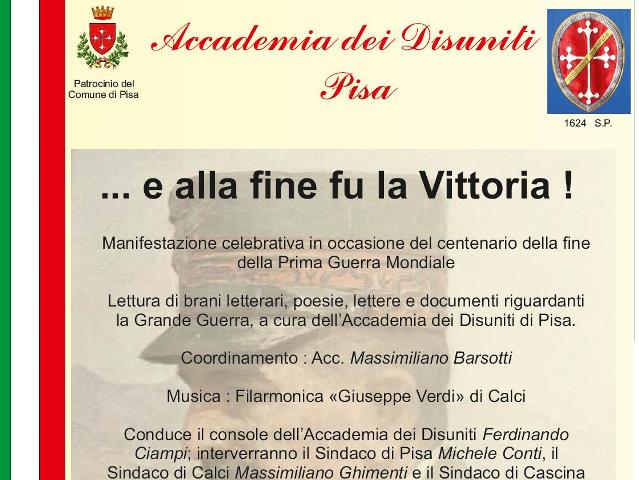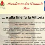 “…E alla fine fu la Vittoria”: l’Accademia dei Disuniti di Pisa ha organizzato una manifestazione per celebrare il centenario della fine della prima guerra mondiale, per sabato 17 novembre alle ore 17 in Logge di Banchi.