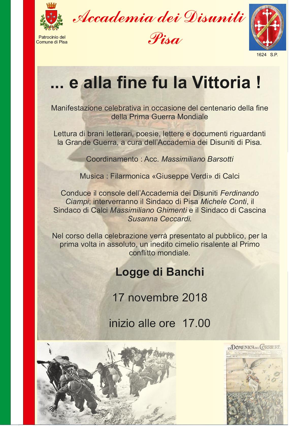 “…E alla fine fu la Vittoria”: l’Accademia dei Disuniti di Pisa ha organizzato una manifestazione per celebrare il centenario della fine della prima guerra mondiale, per sabato 17 novembre alle ore 17 in Logge di Banchi.