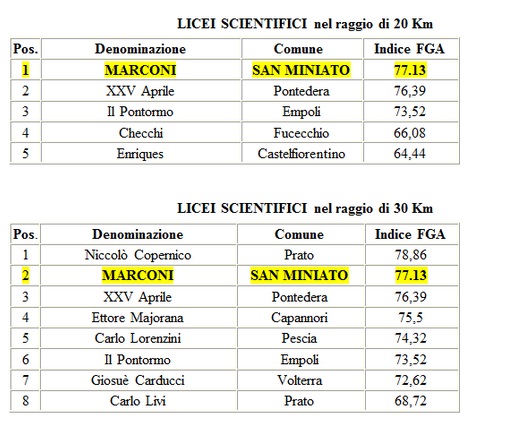 Essa è condotta sugli studenti del primo anno delle Università e si basa su un indice da 0 a 100, denominato FGA, in cui si tiene conto, con un' opportuna normalizzazione, sia dei voti conseguiti dagli studenti che dei crediti complessivamente acquisiti. L'ipotesi alla base della ricerca è che una buona scuola secondaria favorisca innanzitutto un migliore impatto con l' Università. Secondo i dati resi noti lo scorso 7 Novembre, il liceo “G.Marconi” di San Miniato è al primo posto tra i Licei Scientifici della zona (in un raggio di 20 Km), ed al secondo in un raggio di 30 Km. Non sono stati ancora resi noti, invece, i nuovi dati relativi ai Licei delle Scienze Umane, tra i quali, secondo quanto emerso lo scorso anno, il liceo “G.Marconi” si piazzava al secondo posto tra quelli della provincia. Si tratta di risultati molto positivi ed incoraggianti, che dimostrano quanto l’attenzione alla didattica ed a tutti i diversi aspetti della formazione degli studenti abbiano dato i loro frutti nel tempo. Il Dirigente scolastico, prof.P.Robino, esprime grande soddisfazione per i dati resi noti da Eduscopio, che devono essere visti come un successo per la scuola, in tutte le sue componenti, ma soprattutto come un incentivo a continuare a lavorare con la stessa serietà, per offrire agli studenti una formazione di qualità, che permetta loro di raggiungere gli obiettivi, affrontando le sfide del futuro.