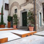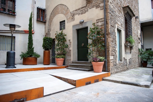 Si è lavorato nel rispetto della piazza, in linea con elementi importanti qui presenti quali la casa torre medievale del XIII secolo e il condominio progettato dal celebre architetto Giovanni Michelucci nel 1954. Nella piazzetta sono state inserite varie piante in vaso, di diverse forma e dimensione, con alcune pedane. Ridando ampiezza e pulizia al passaggio, si è migliorata la qualità della vista verso la casa torre. Le fioriere, realizzate in ferro/corten, con piante sempre verdi, creano un invito al flusso pedonale. Questa è l’unica zona della piazza direttamente visibile da via dello sprone, attraverso il “cannocchiale” visivo del passaggio coperto. La pedana, inoltre, copre parte della pavimentazione attuale, con un pavimento flottante da esterno, ispezionabile, che regolarizza i livelli in armonia con i toni di colore della torre.