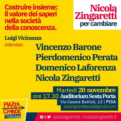 La campagna toscana di Nicola Zingaretti parte martedì da Pisa, con un'iniziativa sui saperi nella società della conoscenza insieme al direttore della Scuola Normale Vincenzo Barone, al direttore del CNR Domenico Laforenza e al Rettore della Scuola Sant'Anna, Pierdomenico Perata, intervistati dal direttore del Tirreno Luigi Vicinanza. Commenta la Consigliera Regionale Alessandra Nardini: "Come abbiamo già dimostrato alle primarie di ottobre, dalla Toscana può partire il cambiamento del PD e la ricostruzione del centrosinistra per liberare l'Italia da questa destra becera. Per farlo il PD deve cambiare radicalmente, deve voltare pagina aprendo una nuova stagione. Io credo che solo la candidatura di Nicola Zingaretti, con la sua piattaforma politica, garantisca questo sguardo al futuro.