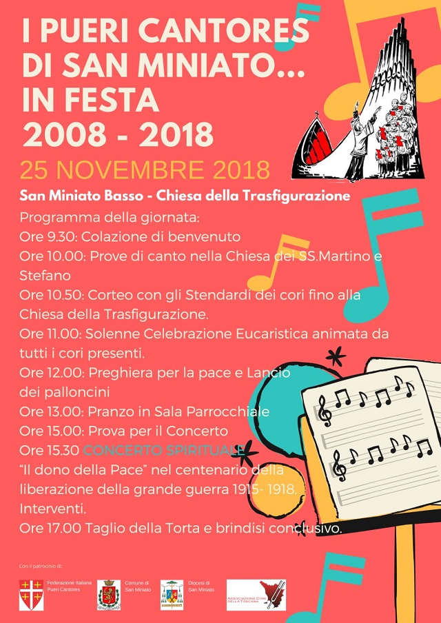 Al mattino alle 11, nella Chiesa della Trasfigurazione sarà celebrata la Messa Solenne da Mons. Luciano Niccolai, Proposto di San Miniato Basso e assistente spirituale dei Pueri Cantores con la partecipazione di tutti i gruppi riuniti. Alle 12.00 in piazza la preghiera per la pace e il lancio dei palloncini. Nel pomeriggio alle 15.30 si terrà il Concerto sul tema “Il dono della pace” in cui interverranno prima i singoli gruppi e poi tutti insieme per un finale di brani comuni. Sarà presente anche il m° Salvatore Vivona, maestro di cappella della Cattedrale di Monreale che per l’occasione ha composto un inno alla pace dal titolo “La pace sia con te Gerusalemme” dedicandolo ai Pueri cantores di San Miniato.