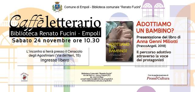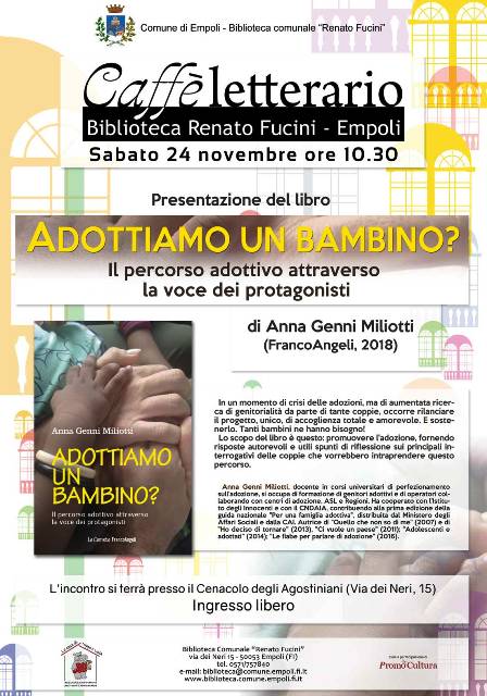 Questo il cuore del libro intitolato "Adottiamo un bambino? Il percorso adottivo attraverso la voce dei protagonisti" di Anna Genni Miliotti edito da Franco Angeli nel 2018, che sabato 24 novembre 2018 alle 10.30, verrà presentato al Cenacolo degli Agostiniani di Empoli, via dei Neri, 15, nell’ambito del “Caffè letterario della Fucini”.