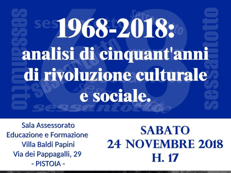 Le associazioni CHARLOTTE ACVP, SUR LES MURS e ROTTA COMUNE organizzano il convegno “1968 - 2018: analisi di cinquant'anni di rivoluzione culturale e sociale”, sabato 24 novembre 2018 alle 17, presso la saletta dell’Assessorato dell’educazione e formazione, Villa Baldi Papini, Via dei Pappagalli n. 29 Pistoia, con il Patrocinio del Comune di Pistoia,con il contributo di Linea Ufficio di Pacini Alessio s.a.s. in Via Landucci a Pistoia.