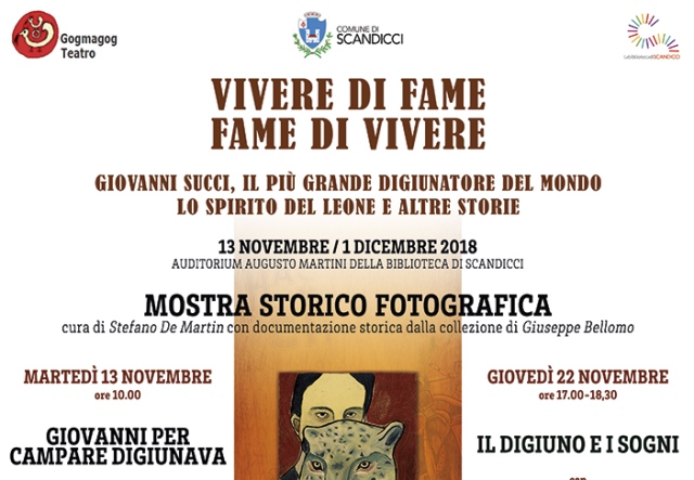 Cento anni fa moriva a San Martino alla Palma Giovanni Succi da Cesenatico, considerato uno dei più grandi digiunatori del mondo. Il Comune, la compagnia teatrale Gogmagog e la Biblioteca di Scandicci organizzano per l'occasione una serie di iniziative, ovvero la mostra storica fotografica “Vivere di fame fame di vivere” da martedì 13 novembre a giovedì 6 dicembre 2018 (inizialmente la conclusione della mostra era fissata al 1 dicembre, poi gli organizzatori hanno deciso di prolungarne la durata) nell'Auditorium Mario Augusto Martini della Biblioteca di Scandicci (via Roma 38/a) a cura di Stefano De Martin con documentazione storica dalla collezione di Giovanni Bellomo, e lo spettacolo “Giovanni per campare digiunava” dei Gogmagog al Teatro Studio Mila Pieralli (via Donizetti, 58) da sabato 24 a mercoledì 28 novembre 2018. Oltre alla mostra e allo spettacolo vengono organizzati anche due incontri: martedì 13 novembre alle 10 la compagnia Gogmagog con il regista della piece al Teatro Studio Tommaso Taddei parlano con gli studenti sulla costruzione dello spettacolo teatrale; giovedì 22 novembre dalle 17 alle 18,30 nell'Auditorium della Biblioteca “Il digiuno e i sogni” con Paolo Albani, performer e autore del libro “I sogni di un digiunatore” (Exorma 2018), Laura Forti, autrice teatrale e collaboratrice di Radio Svizzera, Aldo Frangioni di Cultura Commestibile e lo scrittore Enzo Fileno Carabba. Per i visitatori della mostra una promozione sui biglietti dello spettacolo. Il programma di iniziative è in collaborazione con Città Metropolitana di Firenze, Fondazione Teatro della Toscana e istituti superiori Russell Newton e Sassetti Peruzzi.