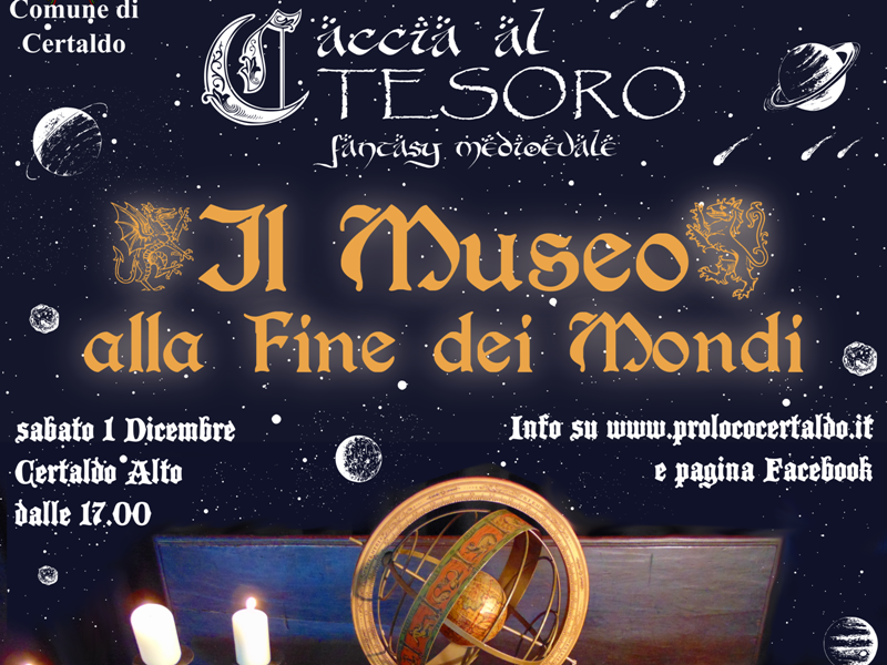 L’Associazione Turistica ProLoco di Certaldo, in collaborazione con il Comune di Certaldo, organizza, sabato 1 dicembre dalle ore 17,00 (ritrovo ore 16.00) in Certaldo Alto, il consueto appuntamento con la “Caccia al Tesoro fantasy medioevale” giunto alla sua nona edizione, il tema di quest’anno è “Il Museo alla Fine dei Mondi”.