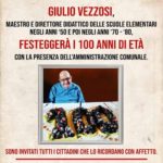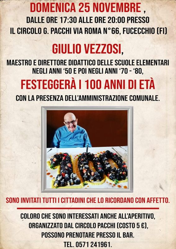 Domenica 25 novembre alle 17 l'amministrazione comunale di Fucecchio festeggerà il centesimo compleanno di Giulio Vezzosi, consigliere comunale e assessore dopo le elezioni amminstrative del 1946, poi per molti anni maestro e direttore didattico delle scuole elementari di Fucecchio, per festeggiare i 100 anni di età. L'incontro al circolo Pacchi di via Roma è aperto a chiunque vorrà salutare Giulio.