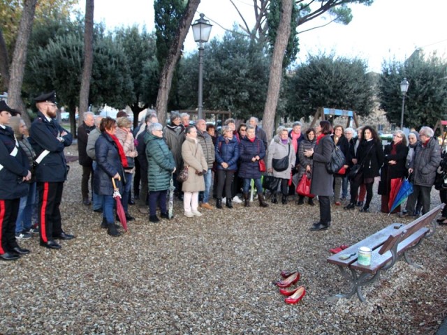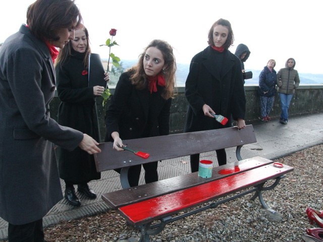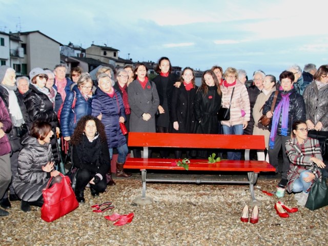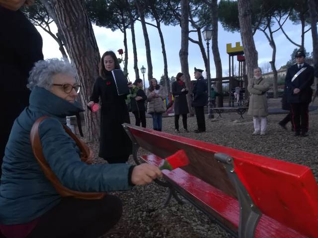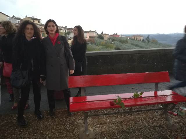 Non un colore come un altro. Ma un rosso intenso, un rosso fuoco, tonalità evocativa di violenza, prevaricazione, morte.  Una panchina di legno e ferro, posta in una delle aree più frequentate dalle famiglie di San Casciano, si è bagnata simbolicamente del sangue di tutte le vittime del mondo, di quelle innumerevoli vite che non ce l'hanno fatta a restare su questa terra e di quelle ' fantasma e invisibili' che, consapevoli e inconsapevoli, subiscono in silenzio, schiave di isolamento, emarginazione, colonizzate strategicamente nella mente, recluse nell'indifferenza emotiva e affettiva di chi le circonda.
