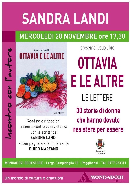 Mercoledì 28 novembre alle 17,30 presso Disco Shop-libreria Mondadori la scrittrice Sandra Landi presenta il suo libro “Ottavia e le altre” accompagnata alla chitarra da Guido Marzano. Una iniziativa di reading e riflessioni, insieme contro ogni violenza.