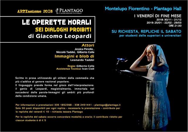 A partire da venerdì 30 novembre 2018, tutti i venerdì di fine mese fino a marzo del prossimo anno, presso la Plantago Hall, via Giro della Mura 76, Montelupo Fiorentino, alle ore 21, Plantago Associazione Culturale presenta: Le Operette Morali, “sei dialoghi proibiti” di Giacomo Leopardi, restituiti in una lettura per la scena, curata da Gilberto Colla, affidata a tre attori con accompagnamenti musicali e supporti visivi.