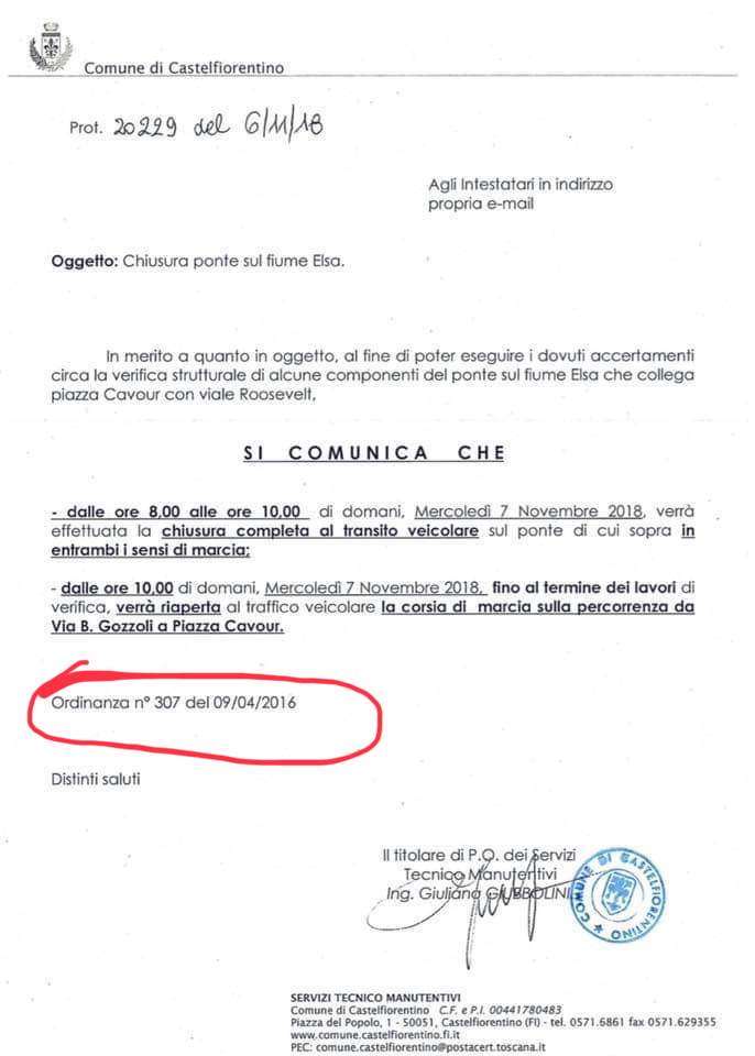 L’ordinanza di riferimento, addirittura datata 2016, è al momento irreperibile sia sul sito del Comune sia all’URP dove la gentilissima impiegata, pur dopo numerosi tentativi, non è stata in grado di fornirla. Ma di questo non c’è da stupirsi visto che in più di due anni non si è riusciti a riparare, neanche sommariamente, la ringhiera dello stesso ponte e non ci sarebbe da sorprendersi se una tale artificiosa “opera” dovesse addirittura impegnare il prossimo mandato elettorale.