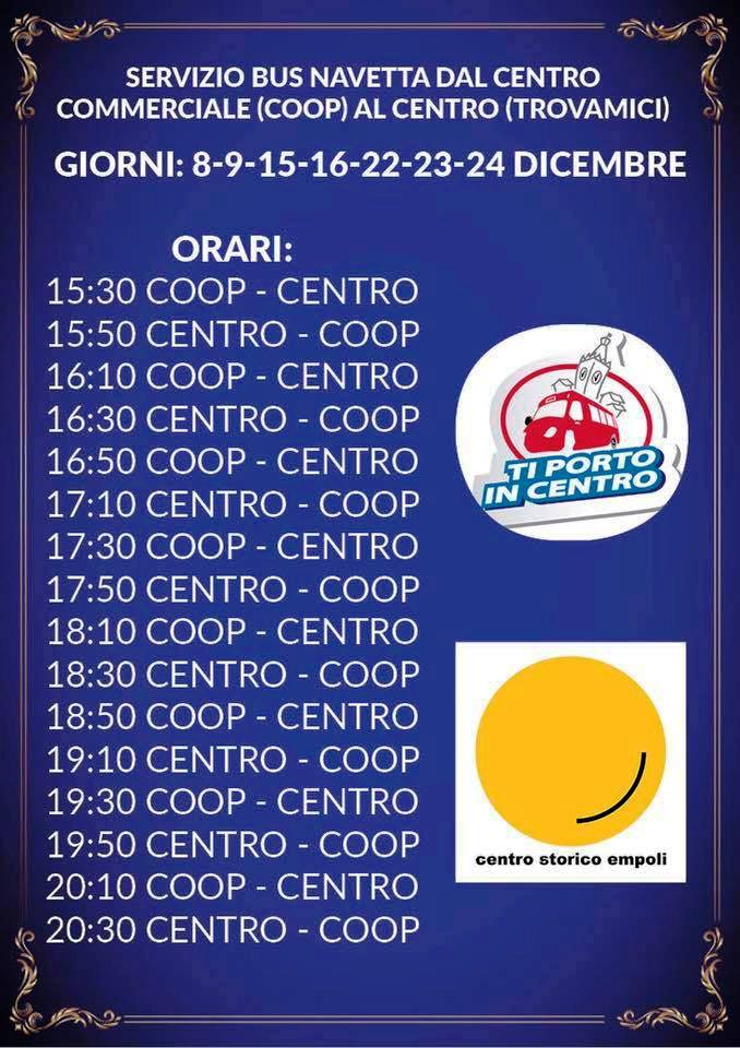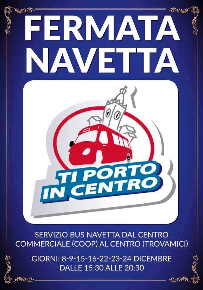 NOVITÀ NAVETTA – Fra le novità dell’ultima ora un servizio di bus navetta dal Centro Commerciale di Via Sanzio al Centro Storico in Via Leonardo Da Vinci. Sarà attivo dalle 15.30 alle 20.30 con varie corse nei giorni 8, 9, 15, 16, 22, 23 e 24 dicembre.