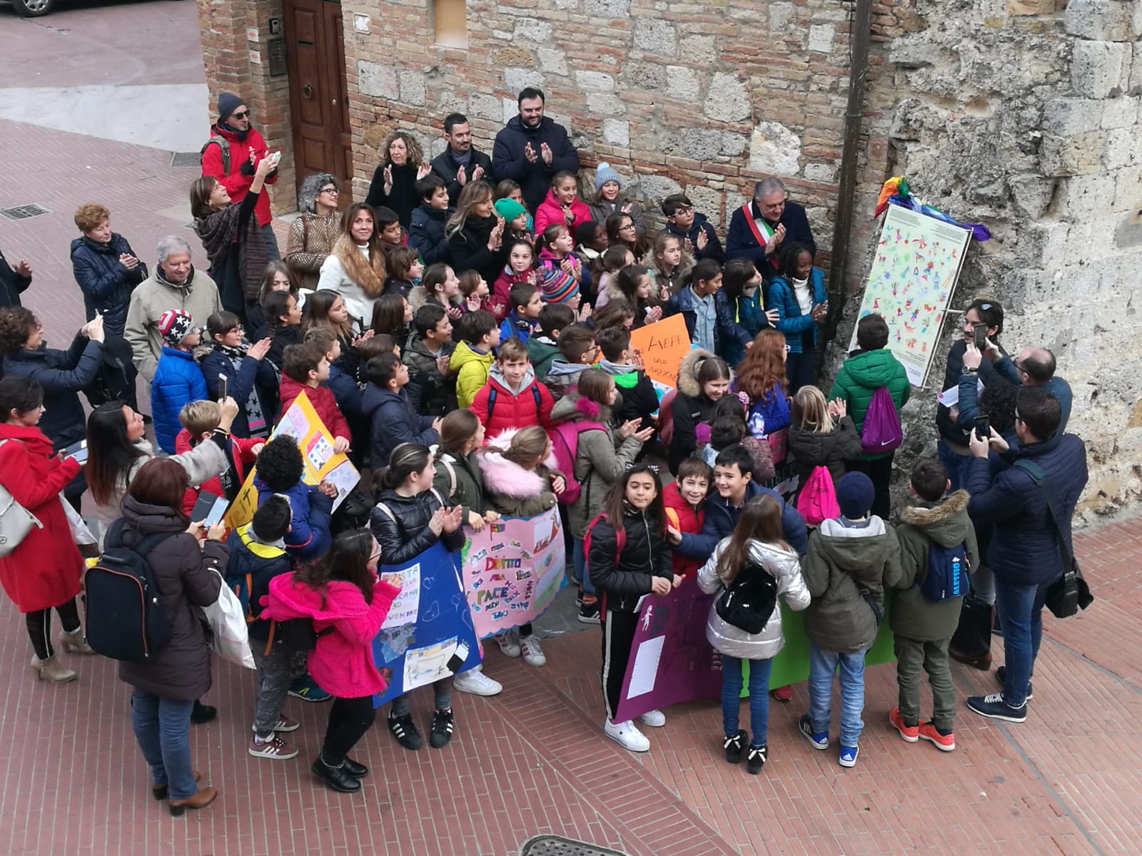 Piazza delle Erbe intitolata alla Dichiarazione Universale dei Diritti Umani per il 2018/2019. Venerdì 30 novembre, in occasione delle celebrazioni per la Festa della Toscana, è stata apposta una targa di intitolazione realizzata sui bozzetti emersi dai laboratori sul tema con gli alunni delle quinte elementari guidati dall’artista Bruna Ferrazzini nell’ambito del progetto “Biriki” dell’associazione culturale Didee con il patrocinio di Amnesty International e dell’amministrazione comunale di San Gimignano. A scoprire la targa insieme al sindaco Giacomo Bassi, alla Giunta e ai rappresentanti del Consiglio Comunale, proprio i bambini delle quinte elementari dell’Istituto Folgore da San Gimignano. A precedere l’intitolazione della piazza anche un consiglio comunale aperto a cui hanno partecipato gli stessi alunni confrontandosi con amministratori e rappresentanti politici con la formale adozione di un ordine del giorno elaborato in occasione del 70esimo anniversario della Dichiarazione Universale dei Diritti Umani per riaffermare l’impegno dell’amministrazione comunale a favore dei diritti umani. Durante la seduta consiliare, alla presenza di Francesco Chiantese, anche la proiezione di un cortometraggio di presentazione del progetto “Città Visibili”, svolto dall’Accademia Minima del Teatro Urgente e finalizzato alla prevenzione del disagio e all’integrazione delle minoranze culturali. Ad ogni piccolo studente, inoltre, è stata consegnata una copia della Dichiarazione Universale dei Diritti Umani aderendo al progetto “Una Dichiarazione in ogni tasca”.