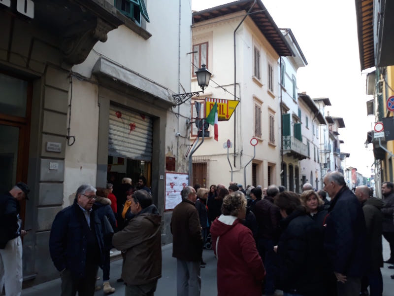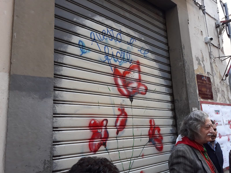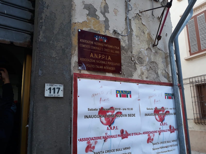 'E questo è il fiore', chi arriva alla nuova sede Anpi di Santa Croce sull'Arno si trova subito di fronte un verso di una nota canzone partigiana. La saracinesca, curata da Elena Salvadorini, è un gran biglietto da visita per lo spazio inaugurato oggi, sabato 1 dicembre, di fronte a decine di persone in corso Mazzini in pieno centro storico. La saletta gremita ha cantato, si è emozionata con l'ottava rima di Emilio Pallesi letta da Pilade Cantoni e ha parlato di temi che sono ancora attuali come i valori dell'antifascismo o dell'antirazzismo.