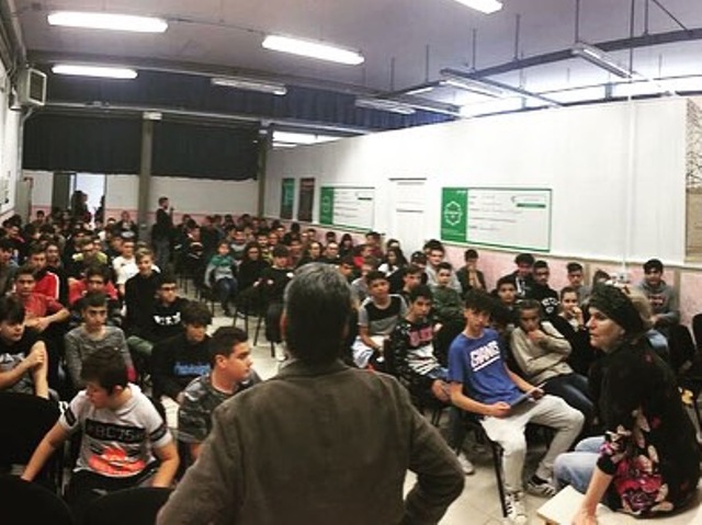 Durante questi anni di viaggi e spettacoli, si è capito quanto sia importante far avvicinare i giovani ai temi che si trattano nel Teatro Reportage dove si parla di conflitti, oppressione, ingiustizia, la vita nei paesi in conflitto del Medioriente dove a causa delle guerre per tanti giovani c' è mancanza di istruzione. Il Teatro di Nascosto per questo collabora da molti anni con le scuole superiori del territorio: lavora con le “classi pilota”, una dell’ I.I.S. “G. Carducci” ed una dell’ITGC “F. Niccolini”. Un rapporto molto importante e continuativo, che dà la possibilità ai ragazzi di seguire Annet mentre è in viaggio per esempio con incontri via Skype, oppure ascoltando direttamente da Annet quello che ha vissuto dopo il ritorno da uno dei suoi viaggi in Iraq, Kurdistan, Palestina, Egitto. Così si è andato a creare un rapporto speciale con entrambi gli Istituti. Grazie a questa collaborazione nei giorni precedenti il Festival, il Teatro di Nascosto ha avuto la possibilità di incontrare 100 studenti dell’ITIS di Pomarance. L’incontro si è tenuto il 14 novembre. Le storie raccontate da Annet vissute in questi vent’anni hanno catturato l’attenzione di tutti i presenti, alcuni dei quali sono intervenuti con domande: è una cosa molto importante perché non sempre questo accade, per la paura di sbagliare o di essere giudicato. Era bellissimo vedere i loro volti completamente concentrati nel sentire i racconti, anche se spesso duri. Durante i giorni del Festival le scuole sono state particolarmente coinvolte la mattina del 24 perché nel Cinema Centrale si tenevano varie proiezioni di cortometraggi curati da Ali El Kareem, documentarista dell’Iraq, che vive a Berlino. Data l’originalità del suo lavoro, Ali El Kareem è riuscito a trasmettere agli studenti tutte le emozioni necessarie a far capire la vita nei paesi di guerra. Dal ITCG “Niccolini” e dal Liceo “Carducci” sono stati presenti circa 100 studenti. Oltre a questa grande partecipazione, alcuni studenti hanno dato un grande aiuto nell’organizzazione del Festival “20 anni di Teatro Reportage”, anche grazie al fatto che attraverso una convenzione gli studenti che si impegnano, vedono riconosciute le ore come alternanza scuola- lavoro. Siamo grati alla disponibilità dei dirigenti e degli insegnanti delle Scuole Superiori: senza di loro questo non sarebbe stato possibile.