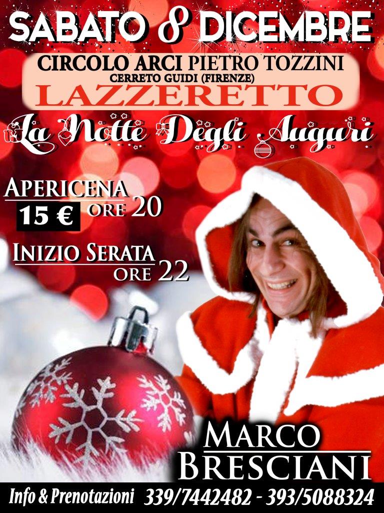 Sabato 8 dicembre al circolo di Lazzeretto (Cerreto Guidi) La Notte degli Auguri con il dj Marco Bresciani. Sarà possibile l'apericena o consumare un semplice aperitivo o un classico cocktail serale. La Serata inizierà alle 20 e alle ore 22 inizierà il capitano Marco Bresciani. Per info 3397442482 - 3935088334
