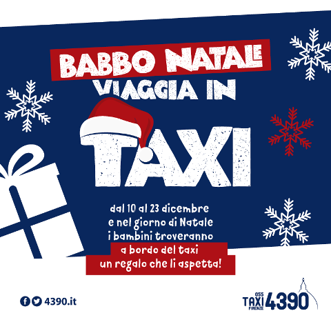 Quest'anno Babbo Natale non arriverà con la slitta, ma userà i taxi per lasciare i regali ai bambini. E' l'iniziativa che il 4390 Taxi Firenze lancia per le prossime festività natalizie. Dal 10 al 23 dicembre e nel giorno di Natale i più piccoli troveranno taxi in versione natalizia, con un pensiero che li aspetta.