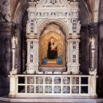 La grande novità che presentata oggi sabato 8 dicembre è la possibilità di ammirare anche il retro di questa affascinate costruzione architettonica dove si può ammirare la scena che raffigura la Morte di Maria e l’Assunzione in cielo, con la consegna della Cintola a San Tommaso. Sono visibili anche quegli emblemi della Vergine, come piccole rose, stelle, o le valve di conchiglia, che caratterizzano tutta la ricca decorazione marmorea. In questa parte, inoltre, l’Orcagna iscrisse la sua firma e la data in cui concluse i lavori: il 1359.