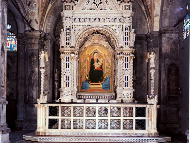 Il Tabernacolo di Orsanmichele rappresenta, sin dalla sua costruzione nel 1359, uno dei punti focali di aggregazione della religiosità comunale fiorentina: una costruzione architettonica vera e propria, aggiornata su esempi di decorazione gotica molto ricca, inusuale in città. Una grande macchina scenografica in marmo bianco impreziosito da inserti cromatici: rosso di Cintoia e verde di Prato, e di vetro blu intenso o a piccoli motivi geometrici colorati e dorati. In origine anche i rilievi marmorei erano dipinti, così come i finti drappi sospesi sopra gli archi del tabernacolo e il partito architettonico erano fittamente decorati su tutti i lati in un trionfo di colori, come un’oreficeria contemporanea, sfolgorante alla luce delle lampade a olio. Le tracce di questo progetto originario riemergono al meglio al seguito della delicata operazione di spolveratura realizzata in questa occasione.