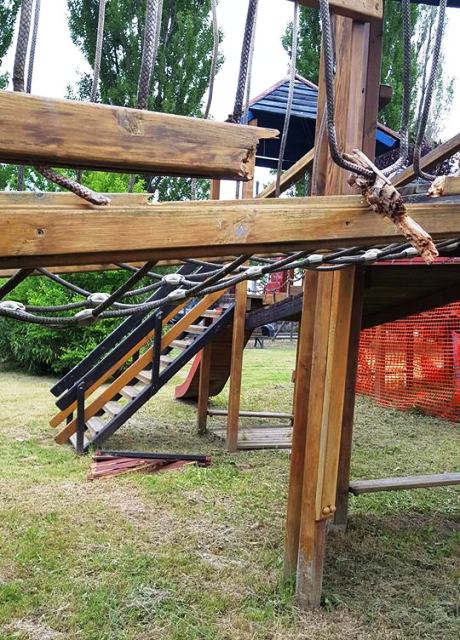 Diversamente dai giochi in legno che erano presenti a Casenuove , costituiti da struttura lignea, per limitare lo manutenzione delle nuove strutture ludiche, è stato scelto di impiegare giochi con struttura portante in acciaio zincato, con balaustre e porzioni in polietilene ad alta densità.
