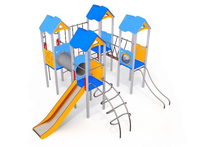L’area ludica è una sola, ma sarà divisa in una parte con giochi per bambini da 1 a 3 anni: con altalena con cesto; torretta con scivolo; gioco a molla e pannello gioco-alfabeto; nell’altra parte giochi adatti per bimbi da 3 a 11 anni: gioco composito strutturato, con torri, scivolo, ponte con camminamento in rete; salita, pertica, tunnel, scala, rete di arrampicata.,