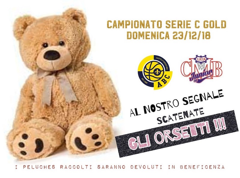 Domenica 23 dicembre, in occasione della dodicesima giornata di serie C Gold che vedrà scendere in campo Abc Solettificio Manetti e Cmb Junior Lucca, peraltro partita di cartello per l’alta classifica, al primo canestro realizzato il pubblico lancerà i peluches in campo, gli arbitri fermeranno il match e tutti i peluches raccolti saranno devoluti in beneficenza.