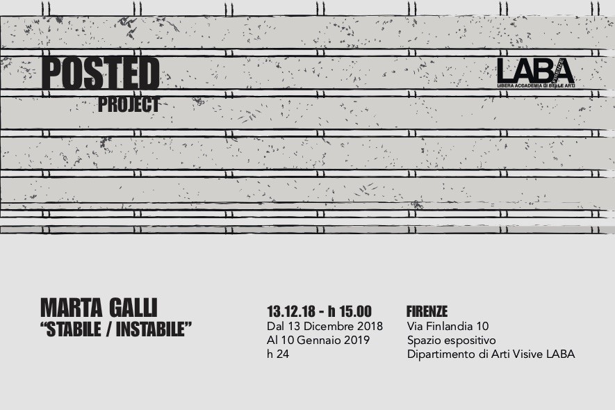 Posted Project, lo spazio-vetrina della Laba di Firenze, accoglie un nuovo progetto espositivo. Sarà visibile da oggi al prossimo 10 gennaio, nei locali del Dipartimento di Arti Visive (in via Finlandia 10), la mostra dal titolo “Stabile/Instabile” della studentessa Marta Galli. L’inaugurazione è fissata per questo pomeriggio a partire dalle 15.