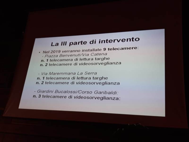 Si tratta della terza parte di intervento relativa al completamento del sistema di videosorveglianza attivo sul territorio comunale. Dopo le prime due che hanno visto l'installazione di 26 'occhi elettronici', dal 2019 sul territorio ne arriveranno altri 9 per concludere il progetto triennale arrivando a 35 in totale. Tre saranno installate in piazza Benvenuti/via Catena, tre in via Maremmana a La Serra e altre tre ai Giardini Bucalossi/Corso Garibaldi. Con l'ultima parte di intervento è prevista la remotizzazione delle telecamere di San Domenico, piazza del Bastione e Loggetta del fondo.