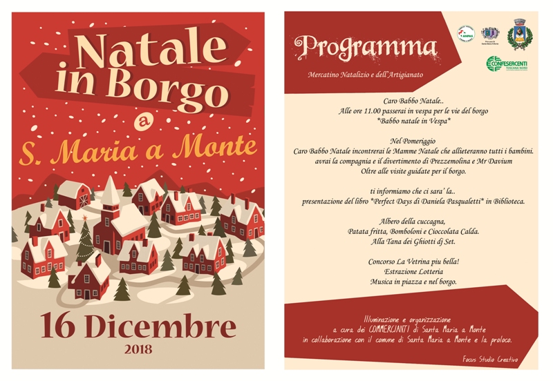 Con l’ingresso nel mese di Dicembre, Santa Maria a Monte inizierà a pregustare il clima natalizio grazie all’iniziativa Natale in Borgo, organizzata dal Centro Commerciale Naturale in collaborazione con la Pro Loco ed il Comune di Santa Maria a Monte.