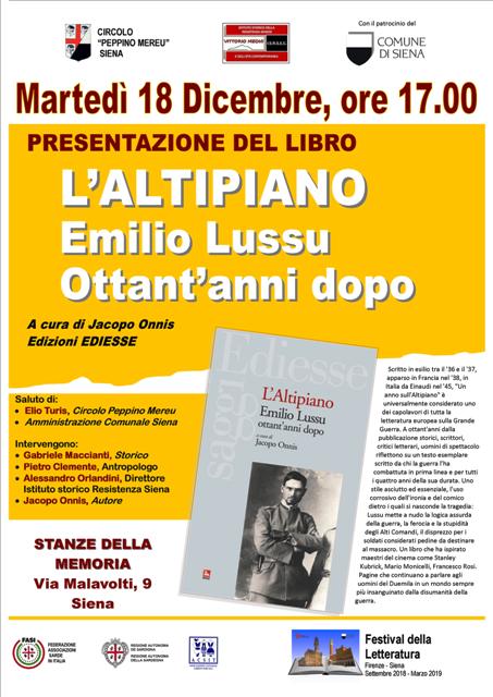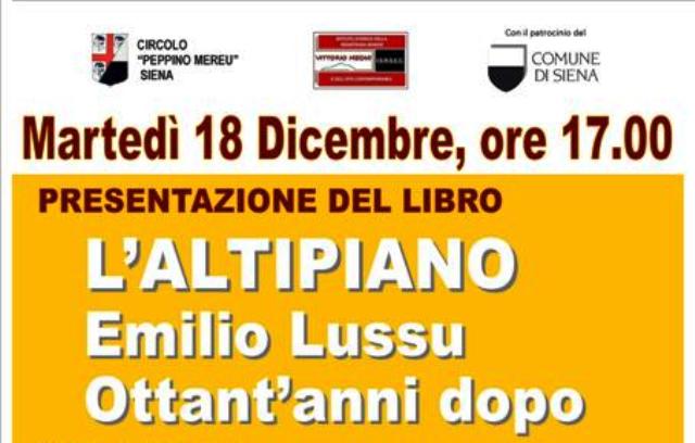 Martedi 18 dicembre 2018 ore 17.00, presso l' Istituto storico della Resistenza, via Malavolti 9 Siena, verrà presentato il libro "L'altipiano. Emilio Lussu ottant'anni dopo" di Jacopo Onnis
