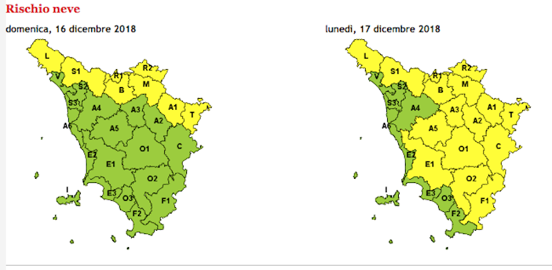 NEVE: oggi, domenica, nevicate a quote generalmente superiori a 500-600 metri sulle zone settentrionali, ma localmente a quote più basse in serata in particolare sull'Alto Mugello. Domani, lunedì, già dalle prime ore della notte quota neve in calo su gran parte della regione, fino a 200-300 metri sulle zone Appenniniche e fino a 300-500 metri sui restanti rilievi. Graduale attenuazione dei fenomeni nel corso della mattinata.Accumuli previsti: Appennino di Lunigiana e Garfagnana e pistoiese fino a abbondanti a quote di montagna, fino a poco abbondanti a quote di collina. Appennino pratese, fiorentino e aretino fino a abbondanti a quota di montagna, e generalmente fino a poco abbondanti a quote di collina, localmente abbondanti sull'alto Mugello. Sulle altre zone saranno possibili cumulati fino a poco abbondanti a quota di collina (Chianti, Colline metallifere, Colline senesi, ect).