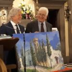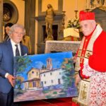 Il Maestro Bertini, coadiuvato dalle sue collaboratrici, Chiara Freschi e Monica Stellini, ha iniziato la cerimonia dei doni, con sue opere facenti parte della collezione “De rerum pictura”, consegnando a Sua Eminenza, il Cardinale Ernest Simoni, un grande dipinto su tela, raffigurante la Chiesa di San Biagio a Poppiano. Alla Arciconfraternita della Misericordia di Firenze, per mezzo del Provveditore dottor Basetti Sani, l’autore ha donato un grande dipinto su tela, raffigurante la Pieve di San Piero in Mercato, commentato da Don Roberto Bartolini, parroco dell’antica Pieve e di Sant’Andrea a Montespertoli, promotore dell’intero progetto “De rerum pictura”, inaugurato il 9 giugno scorso. Il Parroco ha ricordato come Don Milani sia stato battezzato proprio a Montespertoli e come questa terra sia ricca di storia spirituale.