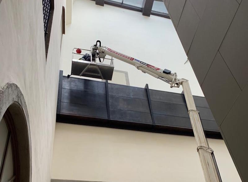 Pulizie di Natale agli Uffizi. L'intervento, portato a termine nella giornata di ieri, è stato condotto negli ultimi due lunedi, consueta giornata di chiusura settimanale in Galleria. I lavori hanno riguardato tutti gli spazi del museo, inclusi gli angoli meno accessibili come i lucernari: per arrivare a pulire anche in questi punti difficili, è stato utilizzato un 'ragno' meccanico, dotato di un enorme braccio metallico capace di estendersi fino a 15 metri di altezza.