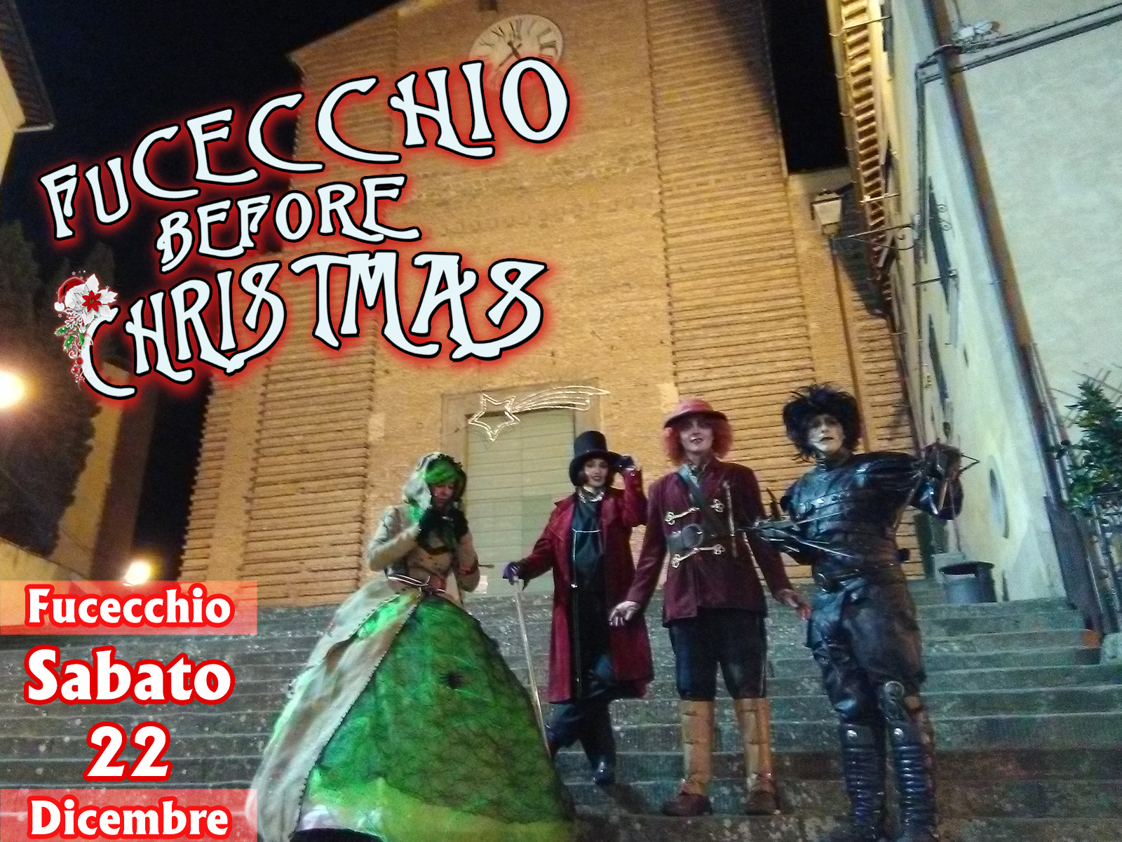 Sabato 22 dicembre dalle 16.00 alle 20.00 ritorneranno i personaggi dei film di Tim Burton per invadere le vie del centro di Fucecchio per un evento unico dedicato al Natale. Un Natale diverso, originale, con personaggi ed animazioni da sogno. E’ questa la grande idea alla base della nuova manifestazione organizzata dal CCN di Fucecchio, dall’Andromeda Eventi e dall’associazione Circolo Fantasy conosciuta da molti per l’organizzazione della Festa dell’Unicorno.