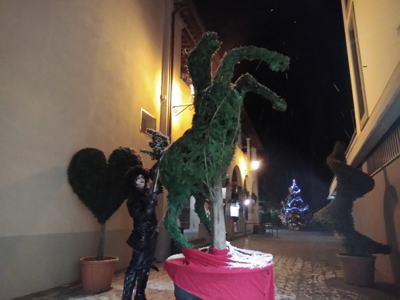 In un angolo del centro storico con opere di arte topiaria fornite dai vivai di Pistoia. Ci saranno piante a forma di cavallo, cervo, unicorno con un personaggio che interpreterà Edward Mani di Forbice all’opera.