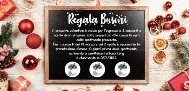 Regala la grande musica sotto l’albero. “Regala Busoni” questo Natale. Un’idea davvero unica e molto originale. È possibile donare un carnet di tre spettacoli a scelta tra i concerti 2019, al prezzo speciale di 30 euro.