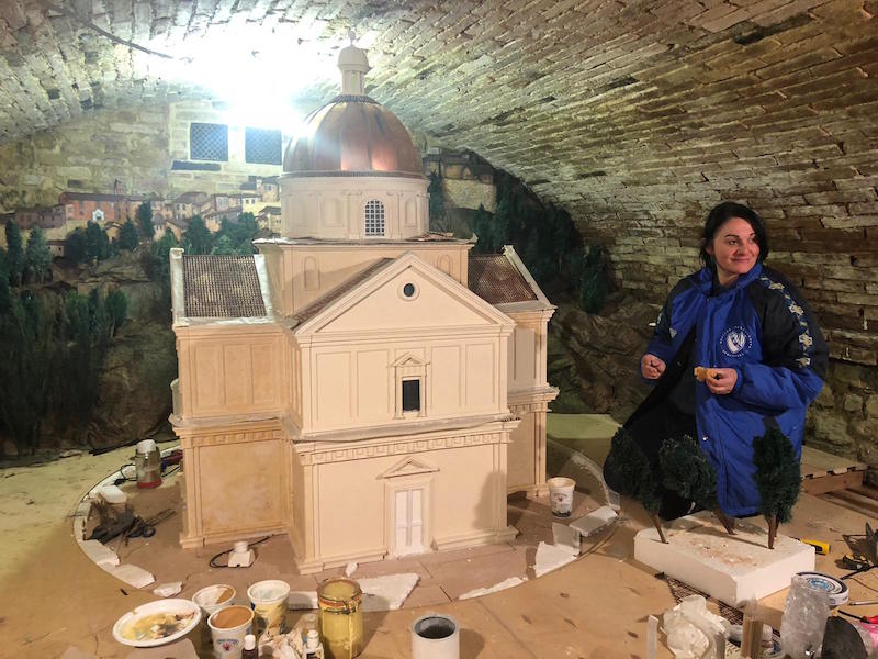 Per costruire il modello della Chiesa, quest’anno oggetto delle celebrazioni giubilari, gli otto volontari – tutti parrocchiani e amici tra di loro – hanno dapprima incontrato, al termine dell’estate, la Parrocchia di Montepulciano e la Fabbriceria del Tempio, così da avere tutti i rilievi della Chiesa poliziana e maggiori informazioni possibili per riprodurre con esattezza il San Biagio. Dunque dagli inizi del mese di ottobre, quasi quotidianamente, nel locale attiguo alla Chiesa dell’Abbadia di Montepulciano, la “Compagnia del Presepe”, come amano definirsi, ha lavorato senza sosta per mettere in scala, quasi perfettamente, quanto decine di migliaia di turisti possono ammirare arrivando sul verde prato di San Biagio.