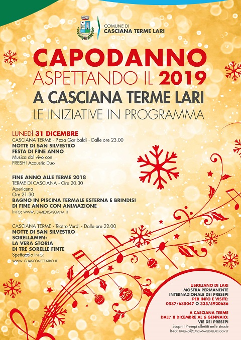 Diverse e per ogni gusto le iniziative in programma a Casciana Terme per trascorrere la notte di San Silvestro. L'Amministrazione comunale, in collaborazione con le associazioni e le strutture presenti sul territorio, promuove anche quest'anno dei momenti conviviali per accogliere nel divertimento e in allegria il nuovo anno. Per chi ama la musica, il ballo e l'animazione c'è il tradizionale appuntamento in piazza Garibaldi a partire dalle ore 23.00. A suonare dal vivo, quest'anno, ci sarà il FRESH Acustic Duo; lo spettacolo è gratuito e aperto a tutti, anche a chi si decide all'ultimo momento. La regia è a cura del Comitato Commercianti di Casciana Terme. Per coloro che invece amano il teatro, c'è lo spettacolo Sorellamen: la vera storia di tre sorelle finte in programma al Teatro Verdi di Casciana con inizio alle ore 22.00. Testo e Regia di Andrea Kaemmerle. Per prenotazioni e info www.guasconeteatro.it.