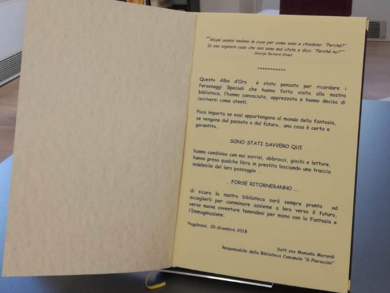 Babbo Natale, arrivato in Bibliobus all’Accabì, ha ricevuto dal Sindaco David Bussagli la carta d’identità onoraria, per potersi iscrivere in biblioteca dove ha inaugurato l’Albo d’Oro degli utenti. “Un Albo pensato per ricordare i personaggi speciali che hanno fatto visita alla nostra biblioteca, l’hanno conosciuta, apprezzata e hanno deciso di iscriversi come utenti”, si legge nell’introduzione all’Albo a cura della responsabile della biblioteca Manuela Morandi.