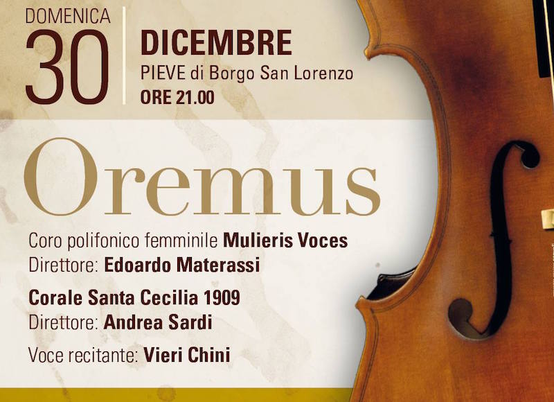 Domenica 30 dicembre alle ore 21:00 presso la Pieve di Borgo San Lorenzo è in programma lo spettacolo musicale “Oremus”. Si esibiranno il Coro polifonico femminile "Mulieris Voces" diretto dal Maestro Edoardo Materassi, e la "Corale Santa Cecilia 1909" diretta dal Maestro Andrea Sardi. Saranno eseguite composizioni tratte dal repertorio polifonico vocale di musica sacra, dal Rinascimento al Novecento, con intermezzi recitanti a cura di Vieri Chini. Lo spettacolo è il secondo appuntamento in cartellone della VI Stagione lirico-sinfonica e si accompagna alle celebrazioni dell’anniversario del bombardamento di Borgo San Lorenzo.